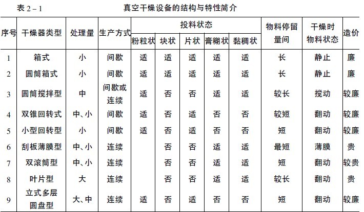 真空干燥就是通過降低干燥室的壓力以降低濕分的沸點(diǎn),達(dá)到在低溫下干燥的目的。工業(yè)干燥設(shè)備按其加熱方式可分為傳導(dǎo)式和對流式兩大類。回顧工業(yè)干燥設(shè)備的發(fā)展,又可分為幾個(gè)階段,五十年代以前,主要是以傳導(dǎo)式(例如箱式烘箱、真空干燥箱)為主。從手工裝卸料發(fā)展到半機(jī)械化、機(jī)械化和連續(xù)式干燥。五十年代以后,干燥技術(shù)的開發(fā)為滿足工業(yè)干燥的處理量大、高效、連續(xù)化、自動(dòng)化的要求,重點(diǎn)進(jìn)行了對流式干燥設(shè)備的研究和開發(fā)。到七十年代初,對流式干燥設(shè)備已取代傳導(dǎo)式干燥設(shè)備的主導(dǎo)地位。但隨著工業(yè)的發(fā)展,在節(jié)能、環(huán)保、潔凈等方面,對干燥設(shè)備提出新的要求,而這些又是對流式干燥設(shè)備一時(shí)難以解決的要求,因而傳導(dǎo)式又得到新的發(fā)展。從七十年代到八十年代初,各種新型的傳導(dǎo)式干燥設(shè)備(例如多層帶式真空干燥設(shè)備、雙錐回轉(zhuǎn)干燥設(shè)備、葉片式、振動(dòng)式干燥設(shè)備等)取代對流式干燥設(shè)備逐漸增多。當(dāng)然為適應(yīng)對節(jié)能、環(huán)保、潔凈的要求,對流式也在設(shè)法加以改進(jìn),例如將傳導(dǎo)式加熱面與流化干燥設(shè)備結(jié)合起來等等。 真空干燥設(shè)備屬于傳導(dǎo)式干燥,即將冷凝器、真空泵與傳導(dǎo)式干燥設(shè)備配套,形成真空干燥裝置。 由于真空干燥具有干燥溫度低、干燥速率大、節(jié)能、沒備密閉防污染等特點(diǎn),因而傳導(dǎo)式干燥設(shè)備大部分可設(shè)計(jì)成真空干燥裝置。真空干燥在生物制品、藥品、飲品以及熱敏性物料、氧敏性物料、溶劑回收待干燥中起到獨(dú)特作用。 真空干燥設(shè)備的分類介紹如下: 隨著工業(yè)技術(shù)的不斷發(fā)展,大多數(shù)采用密閉和接近密閉型的常壓干燥設(shè)備都被設(shè)計(jì)成真空干燥設(shè)備。種類繁多,結(jié)構(gòu)各異。其分類方法也不相同。按操作方式分,則可分為間歇式和連續(xù)式;按干燥過程中物料的狀態(tài)分,則可分為靜止型、翻動(dòng)型、攪動(dòng)型和振動(dòng)型;按干燥機(jī)理分,可分為蒸發(fā)型和升華型。由于真空干燥設(shè)備能用較低的溫度得到較高的干燥速率,能在低溫下干燥熱敏性物料,也可以干燥氧敏性物料。或有燃燒危險(xiǎn)的物料,適用于干燥含有溶劑或有毒氣體的物料。溶劑回收容易,能將物料干燥成很低的水分,并可用于低含水率物料的進(jìn)一步干燥,使真空干燥技術(shù)得到很大發(fā)展。因而成為目前干燥設(shè)備中主要類型之一。 工業(yè)上使用的真空干燥設(shè)備約有二十幾種,表2-1將常見的十多種真空干燥設(shè)備按結(jié)構(gòu)分類進(jìn)行介紹。