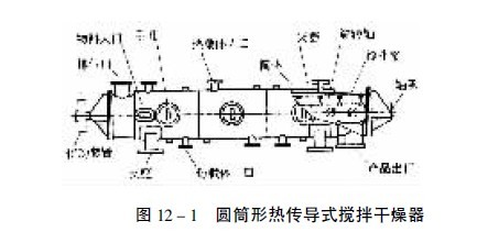 熱傳導式攪拌干燥設備依據攪拌槳葉的結構有圓筒形攪拌槳葉干燥設備,螺旋形攪拌槳葉干燥設備,管形攪拌槳葉干燥設備,圓盤攪拌槳葉干燥設備,楔形攪拌槳葉干燥設備和捏合式攪拌槳葉干燥設備等。 1、圓筒形攪拌槳葉干燥設備圖12-1所示為一種圓筒形干燥設備。在水平安裝的帶有夾套的圓筒體內,沿設備中心設置一根旋轉軸,軸上裝有許多攪拌槳葉,軸的兩端由筒外兩側的軸承支撐。加熱面為圓筒夾套,中心旋轉軸內為不同熱載體。在物料出口處可以通過改變攪拌槳葉方向和角度來調節物料在筒內的滯留時間。 2、螺旋形攪拌槳葉干燥設備此類型干燥設備是在水平螺旋輸送器的基礎上,筒體上增設夾套,內通載熱體改設而成。物料在絞龍輸送的同時達到加熱干燥的目的。螺旋輸送器可以是單軸的也可以是雙軸的。