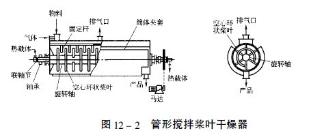 以上兩類干燥設備由于攪拌槳葉不輸入熱載體,加熱面僅來自干燥室殼體夾套,物料的干燥是借助高速攪拌槳葉旋轉產生的離心力,將濕物料分散到容器內表面的夾套部位,與加熱面反復接觸使物料干燥。因此,該類干燥設備攪拌槳葉的線速度為5-15m/s,傳熱系數為116-456W/(℃·m?),物料停留時間約為2-10min。 3、管形攪拌槳葉干燥設備管形攪拌槳葉干燥設備如圖12-2所示。此型干燥室為圓筒形,在一根中空軸上設置若干組空心圓環作為攪拌槳葉,每組由內外兩個同面同心圓環組成,由徑向輻射管連通。干燥所需的熱量由軸和圓環表面及夾套通過熱傳導傳入。相鄰兩組圓環之間,設置一根與筒壁相連的固定桿,以清理附著在圓環和軸上的物料。