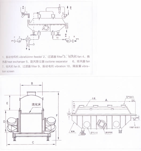 原理 ZLG振動流化床干燥機的物料自進料口進入機內,在振動力作用下,物料沿水平方向拋擲向前連續運動,熱風向上穿過流化床同濕物料換熱后,濕空氣經旋風分離器除塵后由排風口排出,干燥物料由排料口排出。