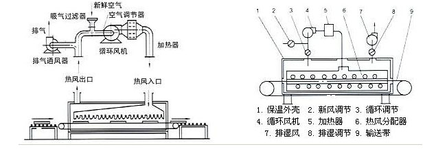 帶式干燥機采用多層移動式不銹鋼網帶堆放物料,熱氣流自下而上穿過網帶及上面的物料,熱交換均勻充分、速度快、蒸發強度高,符合GMP要求,尤其適用于含水率高而干燥溫度不能高的物料干燥,干燥效果好,其物料槽全部采用優質進口不銹鋼材,產品完全符合出食品衛生標準。